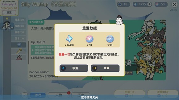 Silly Wisher是B站UP主【sketchi】独立制作的原神模拟抽卡小游戏,其中文名又称“不是元神”。这款游戏收录了原神开服至今所有版本的卡池,各版本卡池包含的角色各不相同,但抽卡时的出卡规则、出金概率均与原神官方设定保持一致。依托真实概率机制,玩家可以在Silly Wisher最新版本中免费抽卡,拥有用不完的原石资源,随意进行十连抽等操作,借此测试自己是“欧皇”还是“非酋”。