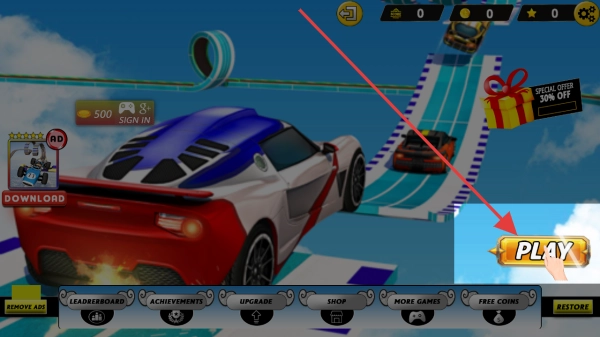 赛车特技操控玩法:驾驶特技赛车在起飞前的位置积攒动力,借助触屏上的组合按键来发动空翻、旋转之类的特技动作,并且要精准把控赛车落地时的角度和速度。