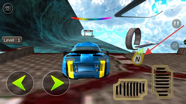 在特技赛道上遇到环形障碍时,要提前按下右侧按键加速,使赛车腾空跃起;在空中通过方向键调整车身姿态,精准穿越圆环,同时收集“N”道具(氮气)来提升行驶速度。