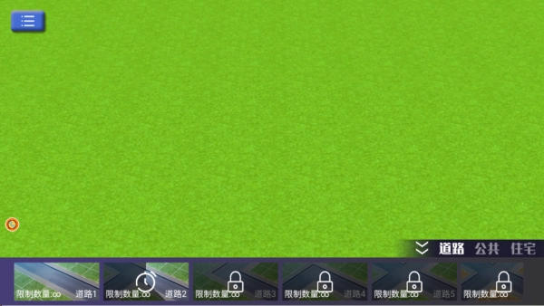 如图所示,此刻我们城市的街道空无一人,大家可以点击画面右下角的道路、公共设施和住宅选项来开展建设工作!