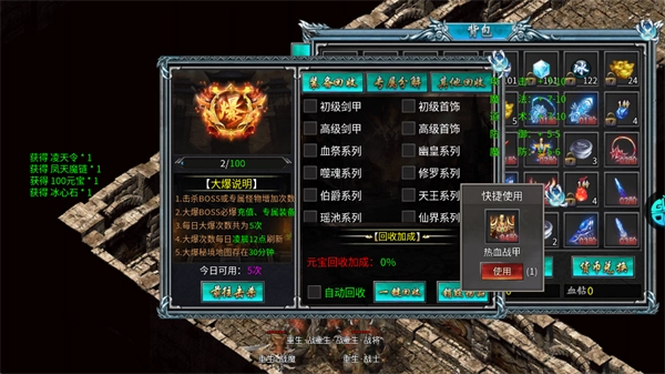 刷怪获得的多余装备可以进行一键回收,获得元宝。