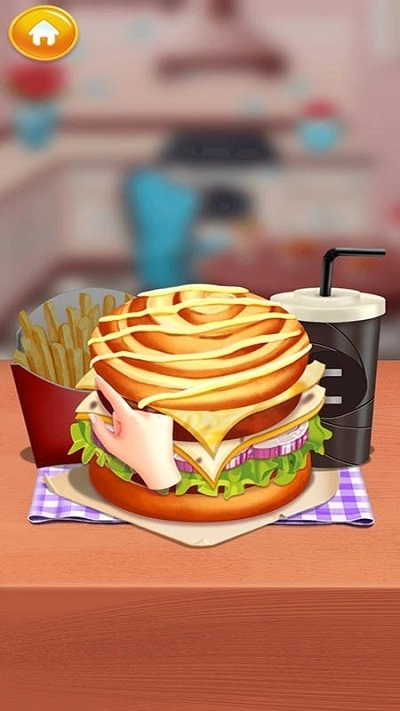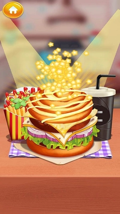 食材制作的动画效果生动有趣,最终呈现的汉堡成品色泽诱人,带来满满的满足感。