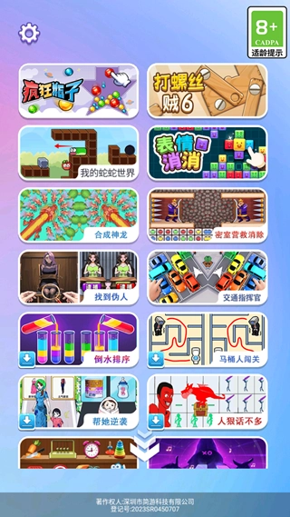 进入游戏后,这里有疯狂瓶子、打螺丝贼6、我的蛇蛇世界、合成神龙、密室营救消除等多款小游戏可供体验。