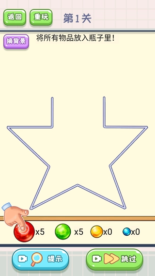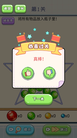 点击疯狂瓶子游戏后,第一关的目标是把所有物品都放进瓶子里,完成这一步就能顺利通关,还能获得丰厚的奖励。