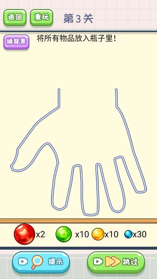 进入第二关后,屏幕底部会为玩家提供1个红球、3个绿球、5个黄球和30个蓝球,玩家只需在规定时间内把所有球都放进瓶子里就行。