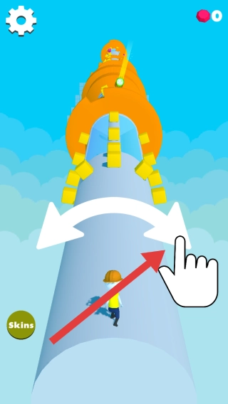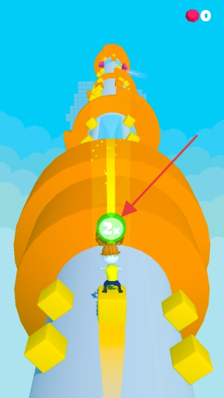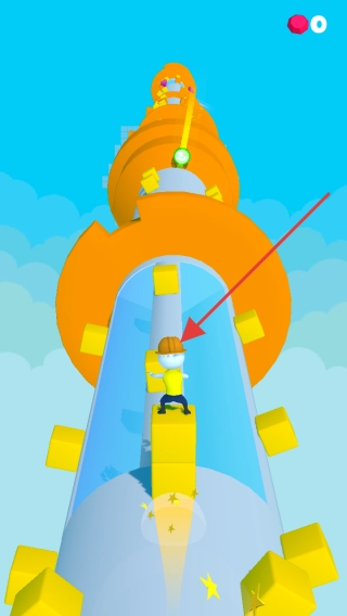控制戴着安全帽的角色,沿着螺旋状的赛道前进,根据左右箭头的提示行动,避开黄色的方块,朝着更高的地方推进,收集路上的道具。