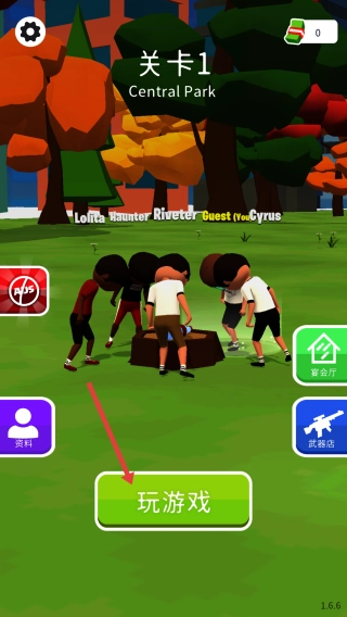 在关卡1(Central Park)的界面中,点击“玩游戏”按钮进入匹配队列,随后会与其他玩家(例如Lolita、Haunter)一同组队或展开对战。