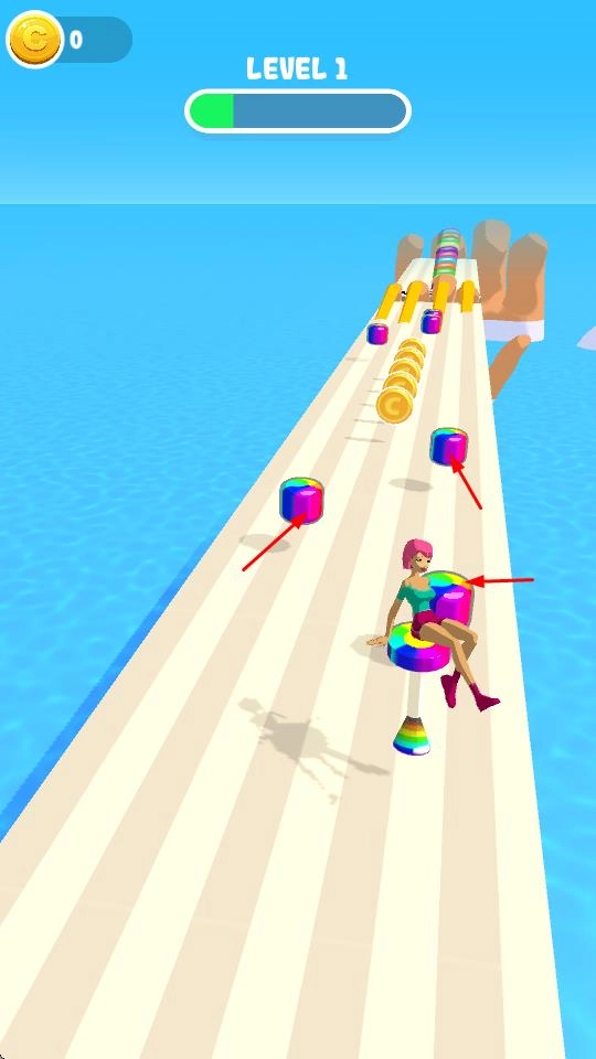 进入游戏后,操控角色在赛道上移动,可向多个方向行进,收集沿途的彩色圆柱等道具,获取金币奖励。