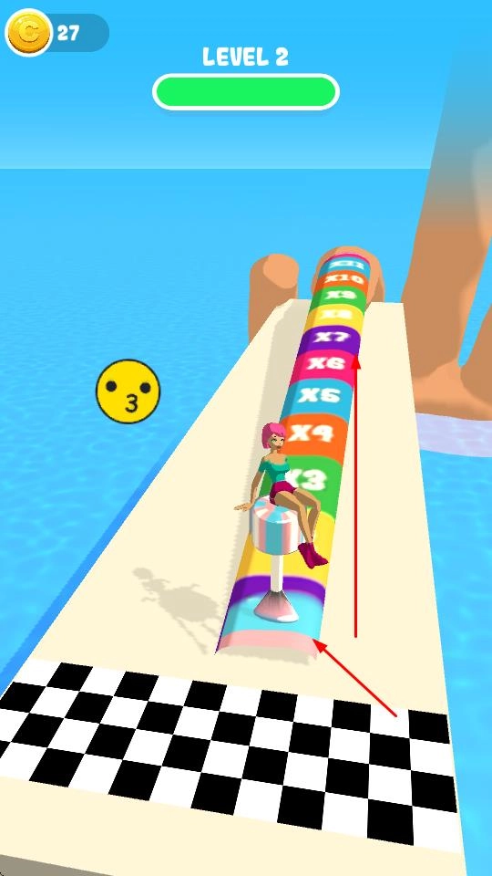 在接下来的关卡里,借助赛道上的倍数标记,提高得分速度,向着终点处的黑白格子区域进发,完成关卡任务。