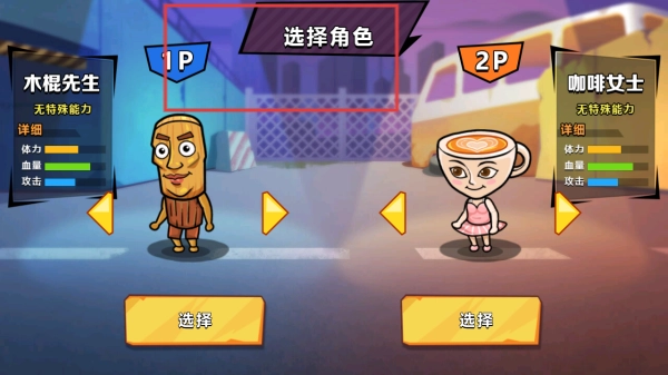 在角色选择界面,你可以看到木棍先生与咖啡女士这两个可选角色,只需点击对应角色下方的选择按钮,就能完成游戏角色的确定。