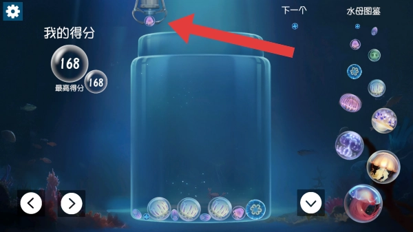 最高得分依旧是168,画面里存在一个大罐子用来放置水母,红色箭头所指之处是下一个马上要掉落的水母。