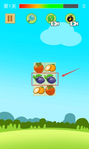 点击红框紫色水果,完成三连消除获得分数。