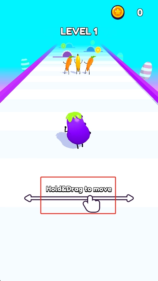 按住紫色茄子角色拖动,控制它左右移动沿着跑道前进,收集前方的胡萝卜同伴与金币,开启闯关之旅。
