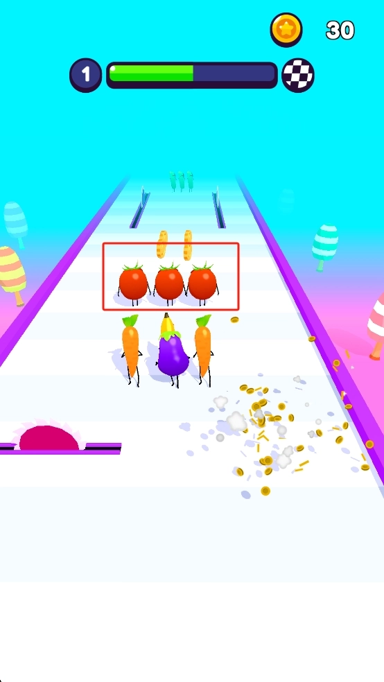 拖动角色躲开跑道上的缺口陷阱,收集上方的番茄角色来壮大队伍,还要拾取散落的金币,保持前进的节奏。