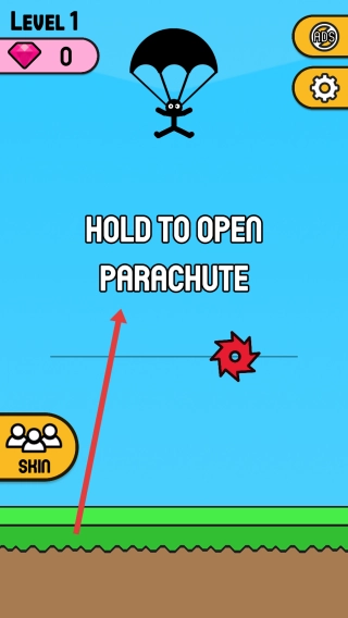 在第一关时,会看到“HOLD-TO-OPEN-PARACHUTE”的提示,此时长按屏幕就能打开降落伞,要注意避开红色齿轮,确保安全降落。