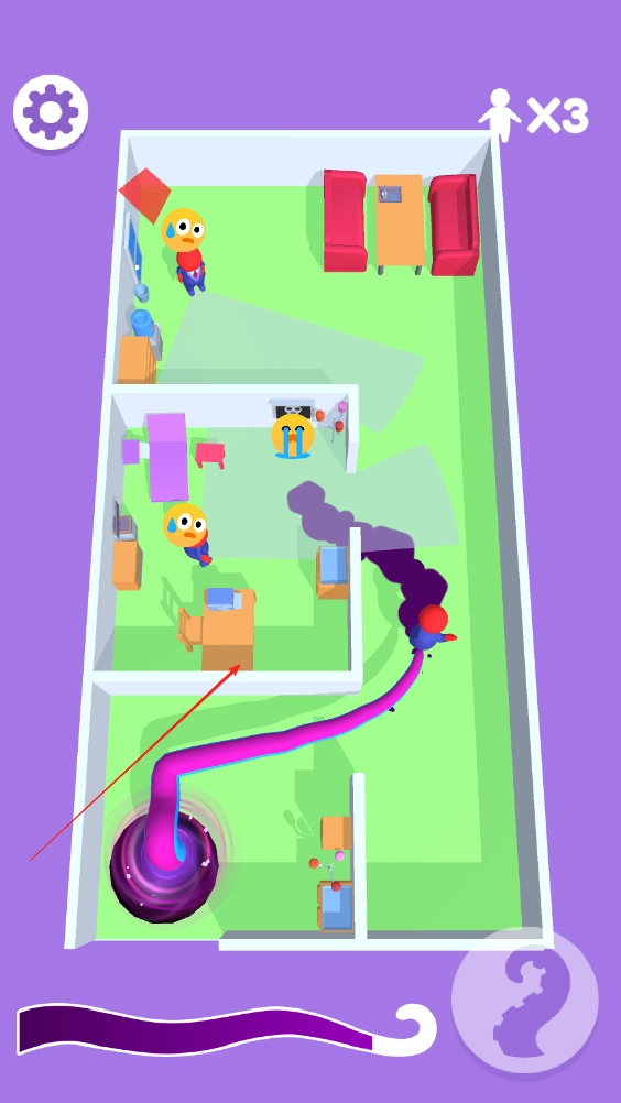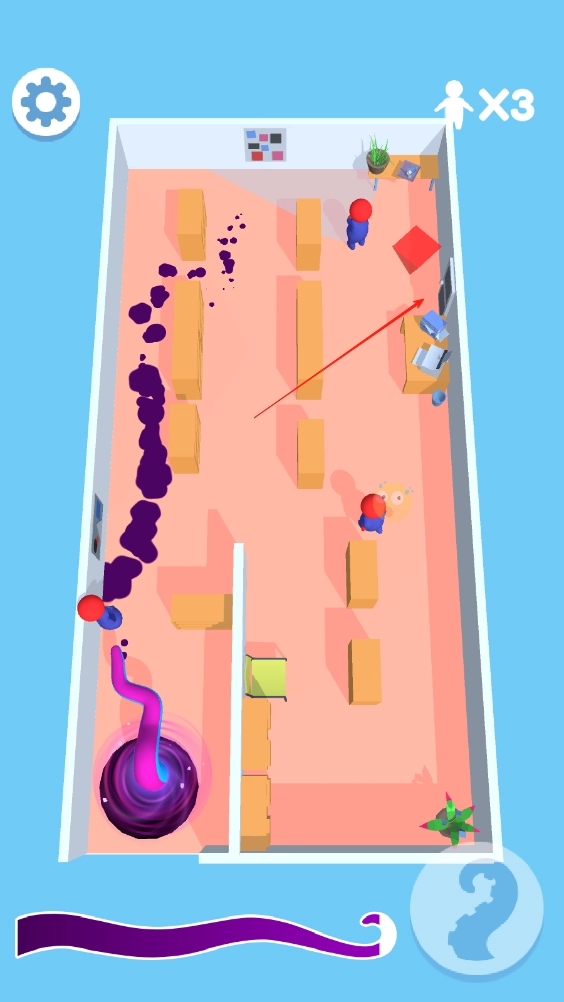 后续关卡的地面会出现红色区域,一旦触手触碰到红色区域,就会惊动地图上所有的小人。此时需要优先抓走其他不在红色区域的小人,之后再抓取红色区域内的小人。