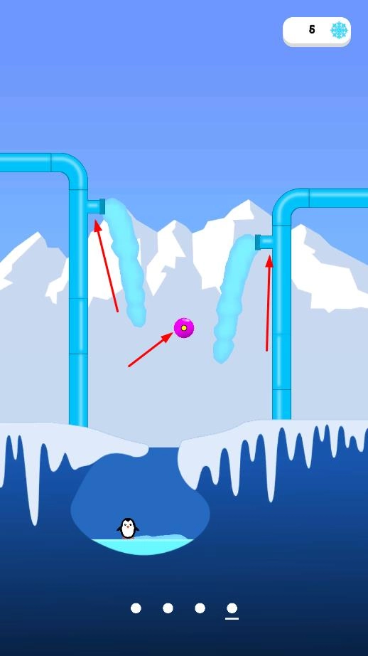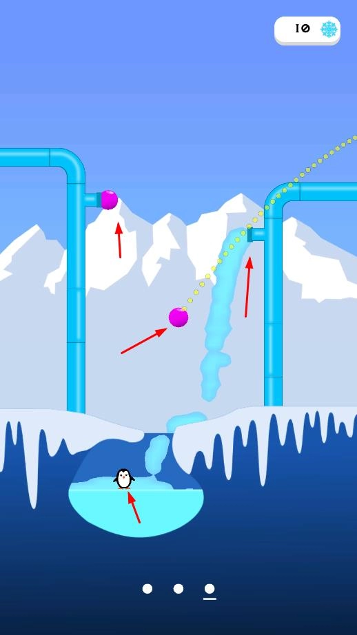 通过点击操作来操控粉色球体的移动轨迹,使水管被堵住,从而解救下方水池中的企鹅。