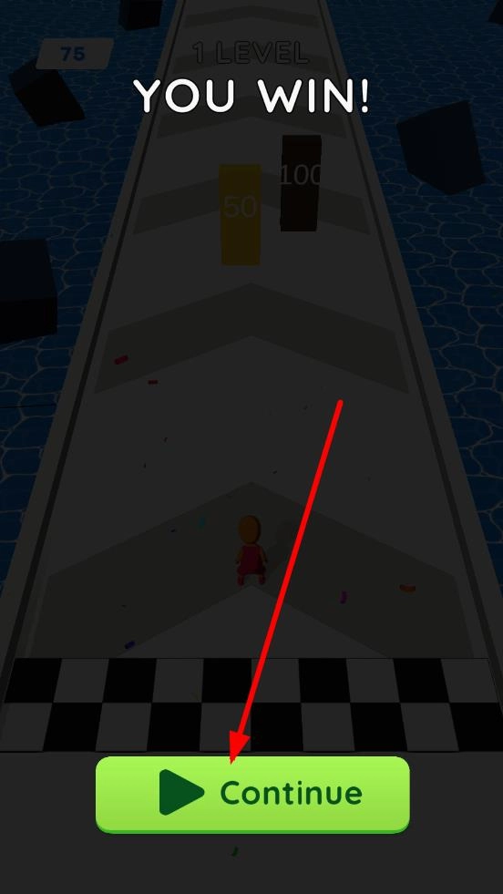 当成功到达关卡终点时,会出现“YOU WIN”的通关提示,同时展示本关的得分以及道具收集状况,点击Continue按钮后,即可进入下一关。