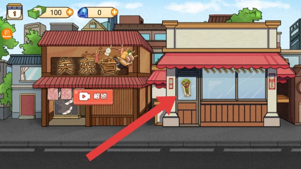 左侧建筑的招牌上标注着关东煮,旁边配有解锁按钮;右侧建筑的门边则有食物图案,整体画面呈现出餐厅相关的经营解锁场景。