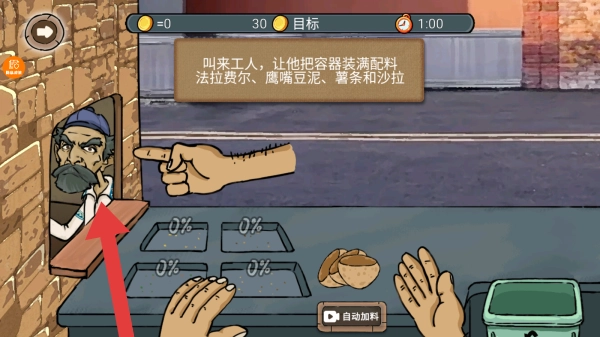 目标是呼叫工人,让他把容器装满配料,然后点击自动加料按钮,以此展现游戏里制作餐食、完成订单的任务流程。