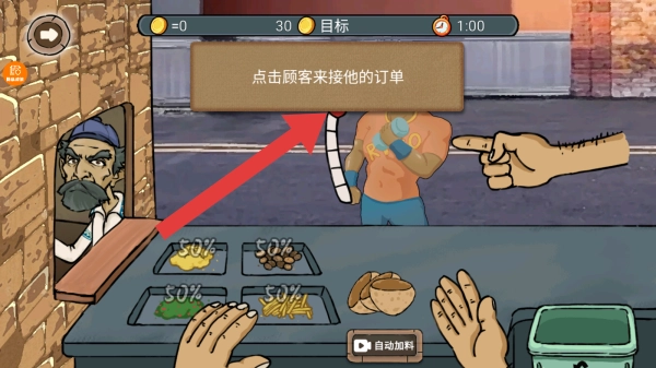 提示文字提示点击顾客以接收其订单,同时融入顾客、餐食配料等场景元素,展现游戏里处理订单的环节。