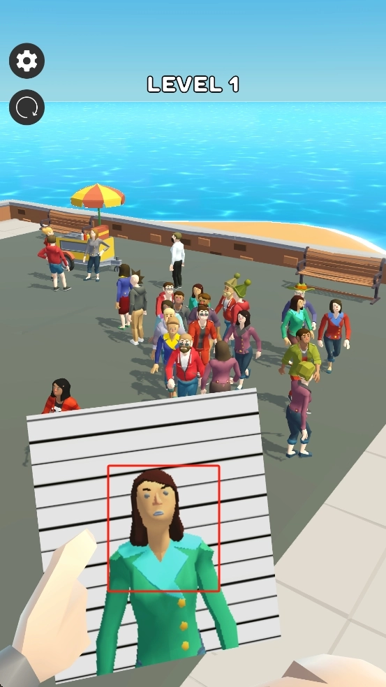 在海滩场景的第一关里,你需要先仔细观察罪犯的照片,把他绿色上衣和深色长发的特征记清楚,然后在人群中迅速找出这个目标。