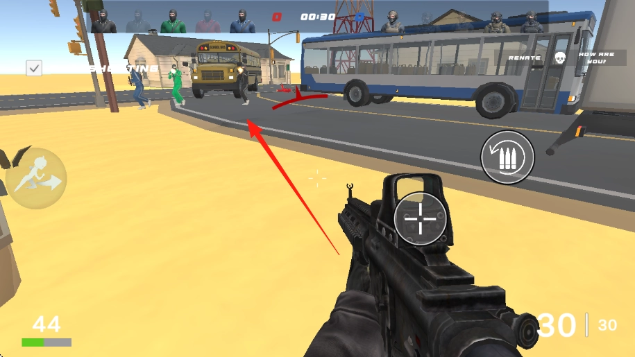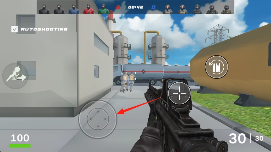 操控虚拟摇杆(位置如图中箭头所示),控制角色移动;同时借助场景中的掩体建筑与车辆,逐步靠近身穿黄、绿两色服装的敌方人物。