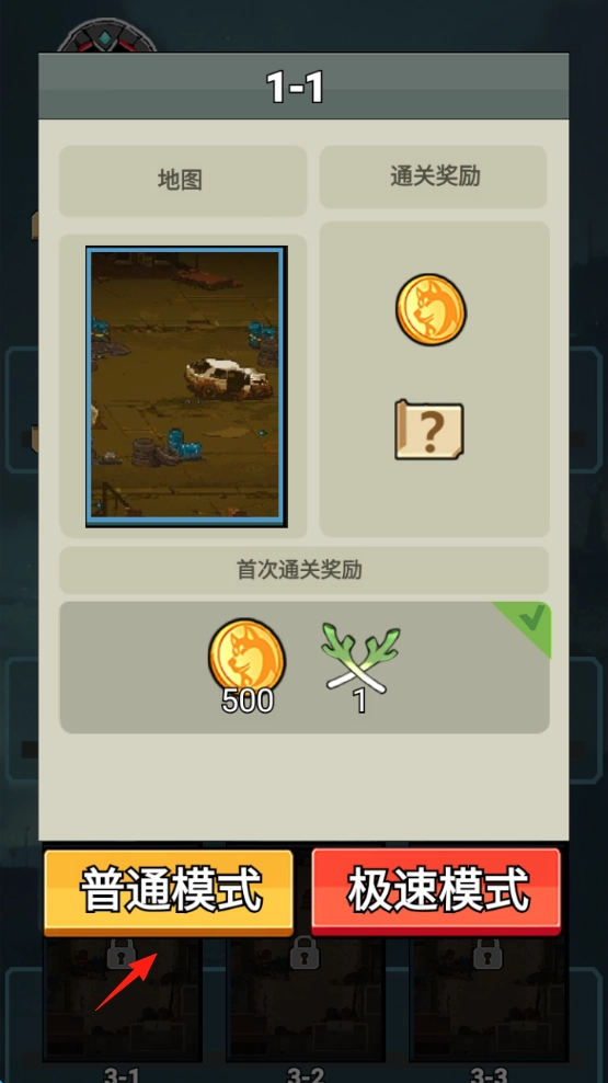 选择关卡1-1,点击普通模式进入,目标是拯救8只小动物,首次通关可获得500金币和道具奖励。
