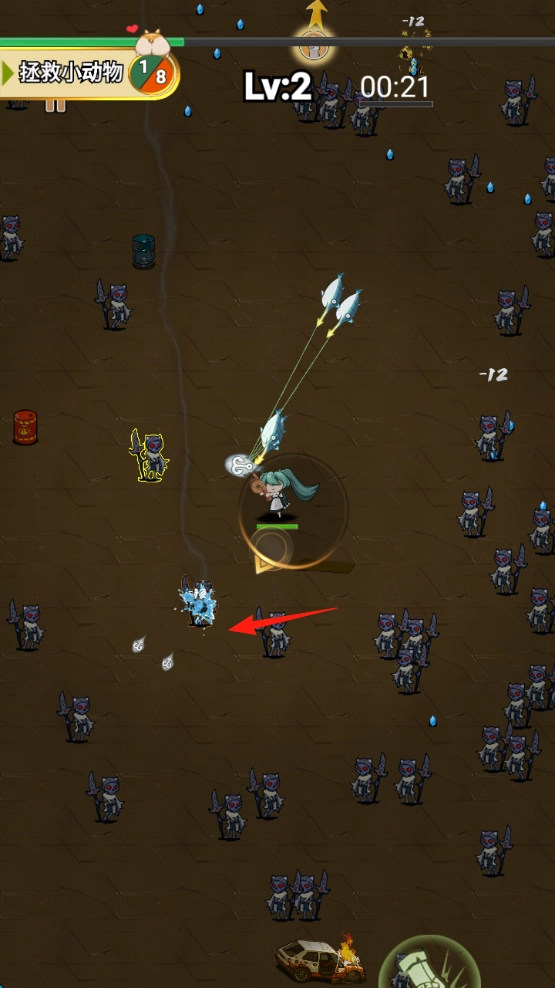 通过升级强化战斗能力,收集场景中蓝色水滴等各类道具,坚持存活至倒计时结束,顺利完成解救小动物的任务,即可解锁全新的关卡。