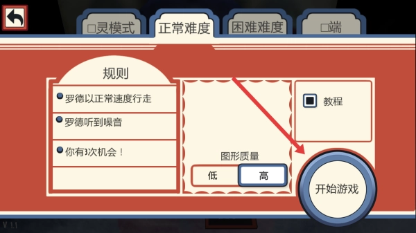 点击选择正常难度,确保图形质量设置为高,勾选教程选项后,点击开始游戏按钮,正式开启冒险之旅。