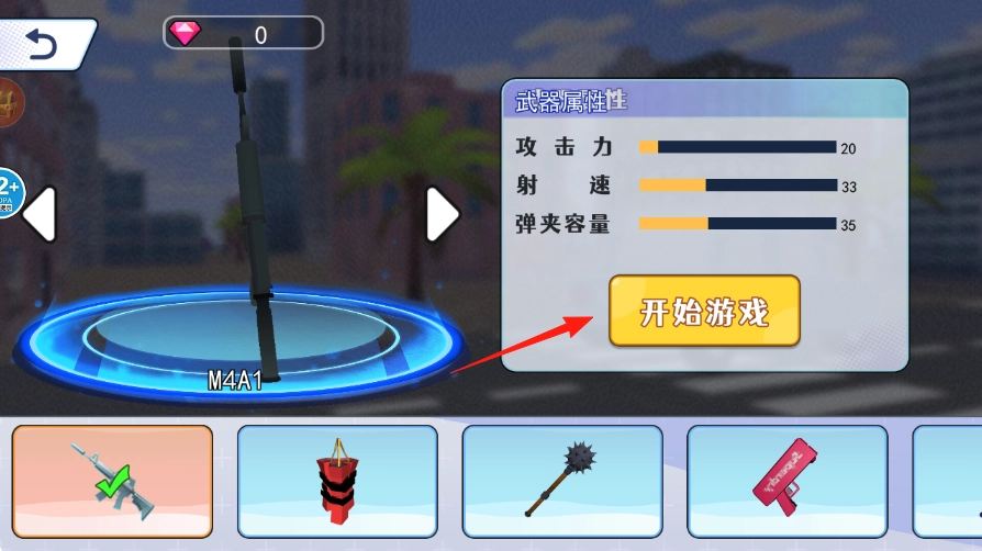 在主界面选择M4A1这类枪械,查看它们的攻击、射速等属性,然后点击开始游戏进入任务环节。