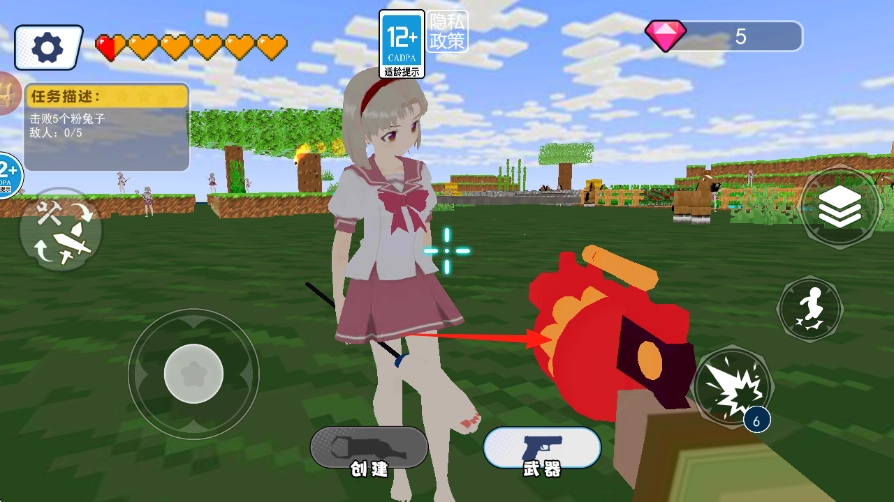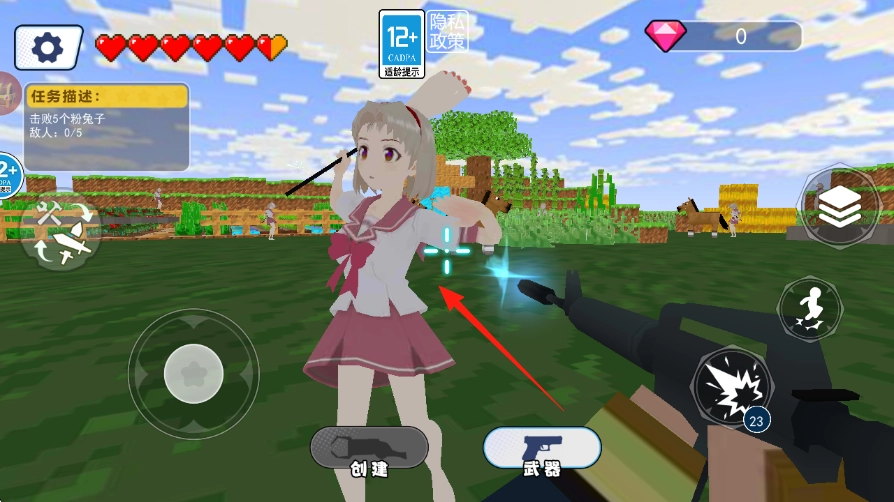 踏入像素草原,通过操控左侧摇杆来移动角色,按下右侧的射击按键攻击粉色兔子敌人,留意当前任务进度显示为0/5。