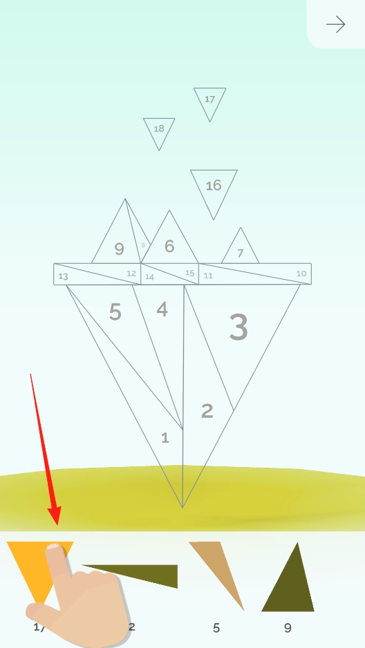 飘在上方的16号和18号三角形是提示,你需要从下方那排数字里找出能与它们匹配的形状。用手拖动选中的三角形时,会看到立体结构上的空缺位置在发光,对准后松手就能完美嵌入。
