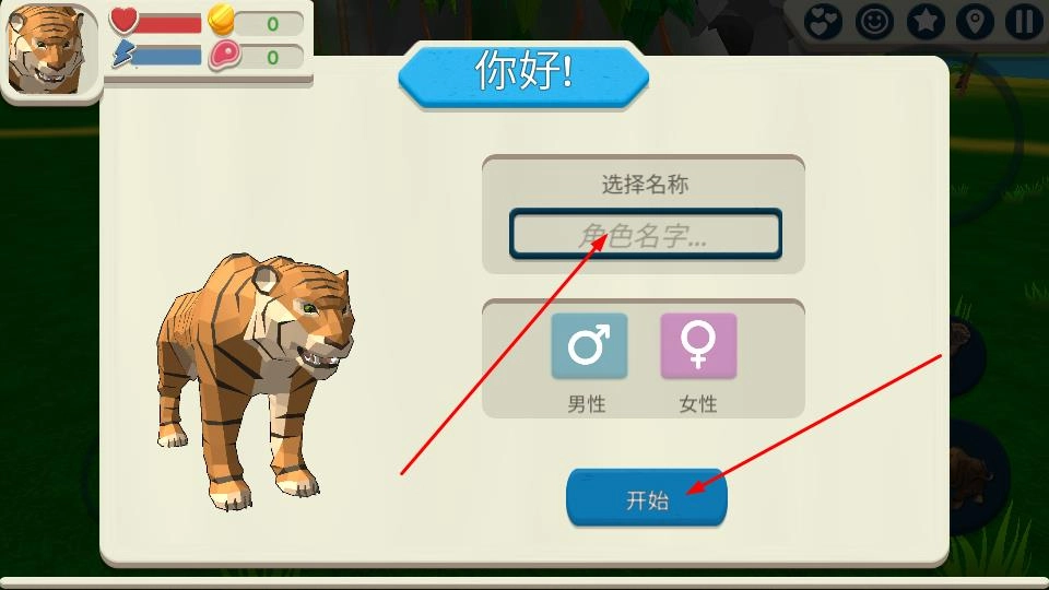 在角色创建界面,首先在角色名字输入框中填写自定义名称,接着选择男性或女性对应的性别图标,然后点击下方的蓝色开始按钮,即可完成角色设定并进入游戏场景。