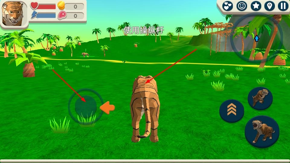 进入游戏场景后,你可以借助左侧的操纵杆来控制老虎的移动方向,再配合右侧的奔跑、攻击等功能按键,在草原环境里探索地形、进行生存互动,从而推动游戏进程。