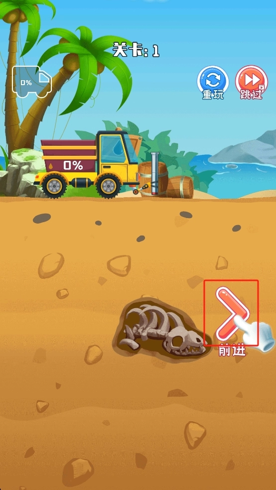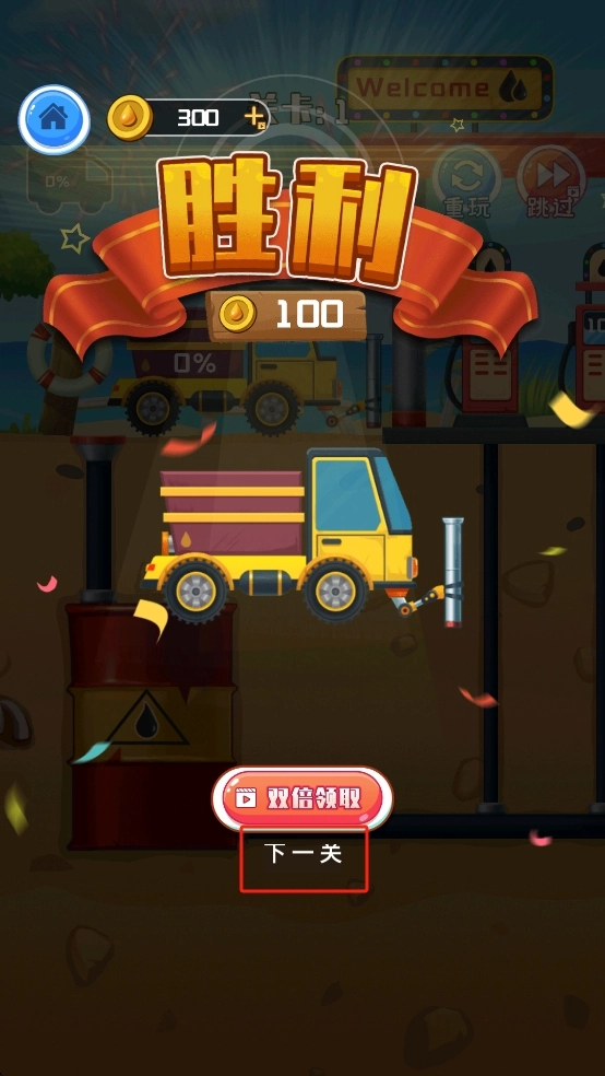 采油任务完成后,界面会显示胜利提示,此时点击屏幕下方的“下一关”按钮,就能进入新的关卡,继续挑战各种不同地形的采油任务。