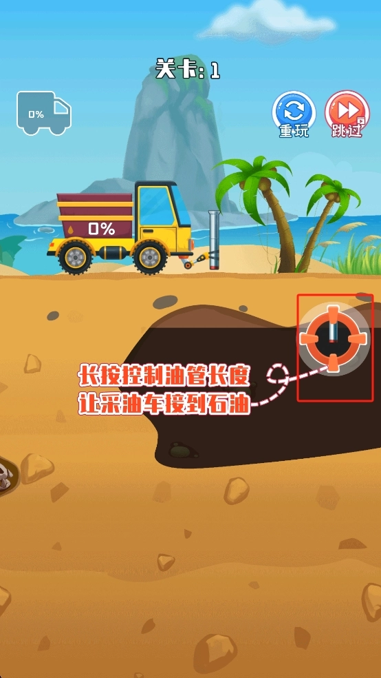 当遇到石油坑时,长按右侧的控制按钮,对油管长度进行调整,让油管能够精准地连接石油坑和采油车,从而顺利完成石油的采集。