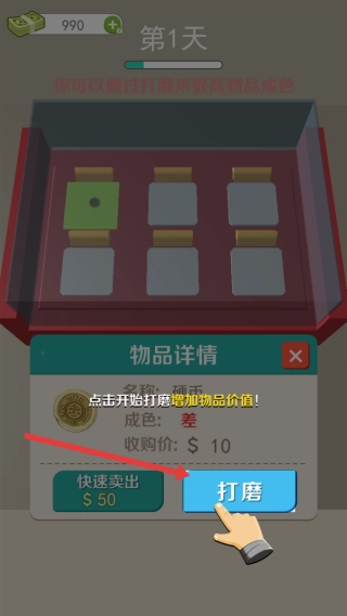 进入物品详情界面后,可点击箭头所指的蓝色打磨按钮,以此提升物品的成色,进而增加其后续的售卖价值。