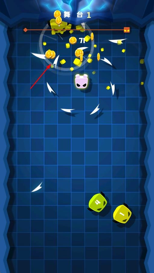 在【舞台1】里,操控角色利用环绕利刃攻击黄色敌人,依靠特效达成破防效果,与此同时收集【12】枚金币。