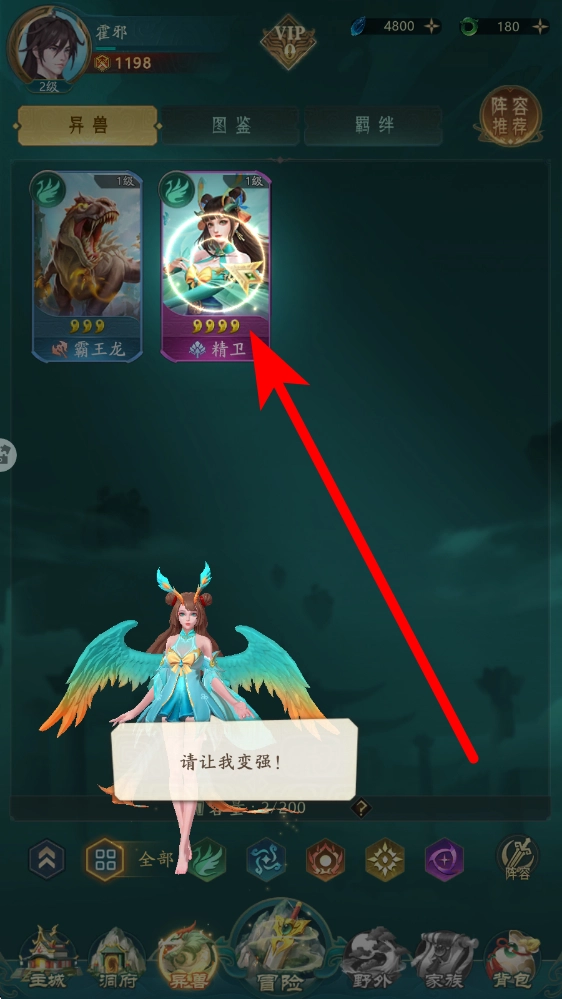 进入精卫的目标异兽页面,点击升级按钮消耗资源提升等级,等级上限受星级限制,通过收集碎片完成升星,解锁更高的等级空间,从而持续强化战力。