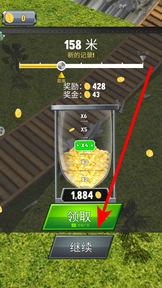完成一段飞行任务后,界面会展示飞行距离、奖励等相关信息,这时你可以点击领取按钮来获取对应的金币等奖励,也能够选择继续,开启下一段飞行挑战。