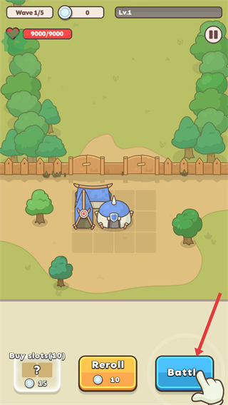 3、完成建筑布置后,点击底部的【Battle】按钮就能开启战斗,建筑会自动进行防御,要留意波次进度和我方状态,之后可以依据战斗情况调整建筑布局。