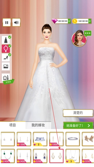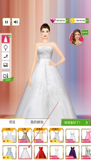 进入游戏后,先查看屏幕上方显示的钻石数量(1001/1002)和爱心数量(100/101),接着点击左侧的裙子图标,然后从下方弹出的列表里选择婚纱,比如白色婚纱就可以。