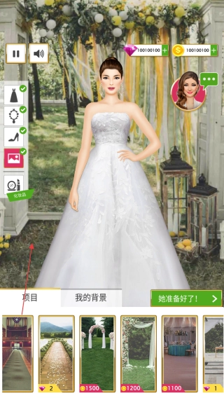 点击左侧的相机图标,接着从下方的背景选项里挑选婚礼相关的背景,像户外花园这类场景都可以,然后完成婚礼造型的设计,以此来打造出完美的婚礼形象。