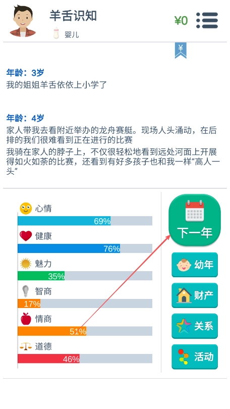在做出选择之后,点击“下一年”按钮来推进游戏时间,这样就能查看事件的结果以及属性值的变化情况了。