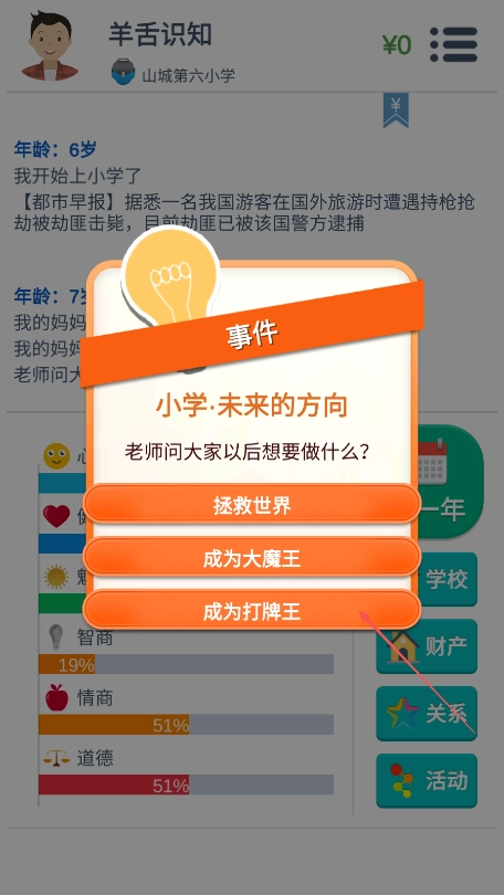 当“小学·未来的方向”这类事件发生时,你需要从“拯救世界”等选项里进行选择,这些选择会对角色的发展产生影响。