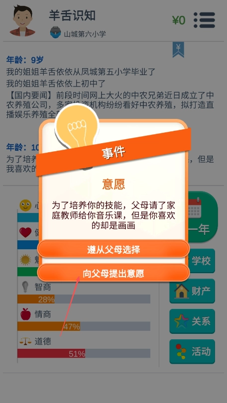 当遇到符合自身意愿的事件时,可根据个人设定的策略,选择向父母表达想法等不同选项,以此来构建角色独特的人生路径。