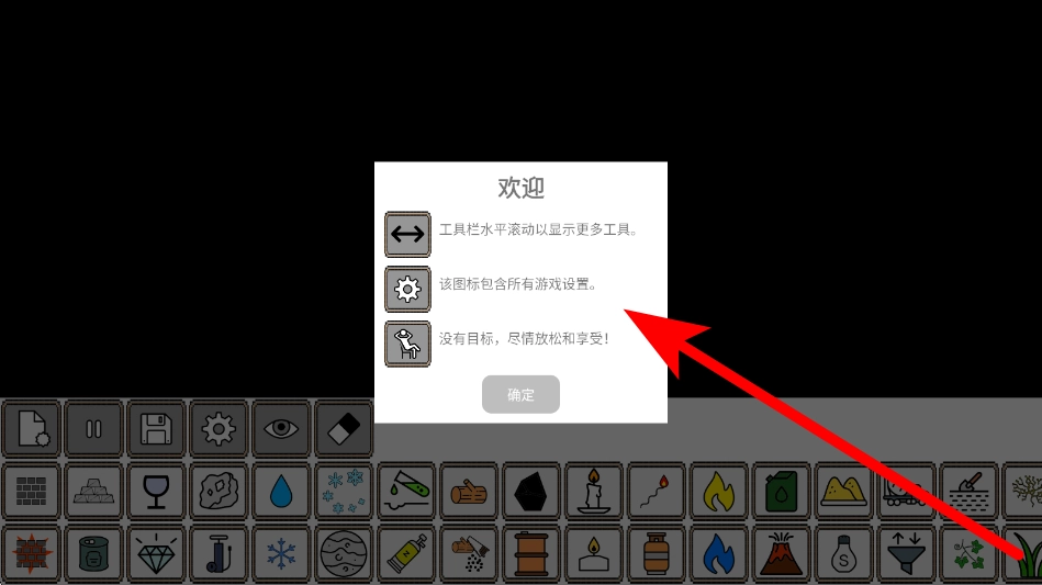 接着熟悉操作流程,仔细阅读游戏的欢迎引导信息,清楚工具栏支持水平滑动以展示更多工具,同时掌握游戏设置等相关的操作规范,为后续的创作环节做好准备。