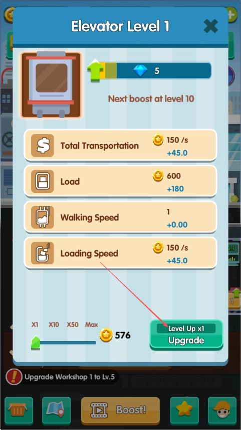 点击电梯图标,即可查看运输、负载等相关数据;若要升级电梯,需消耗资源并点击“Upgrade”按钮完成操作。