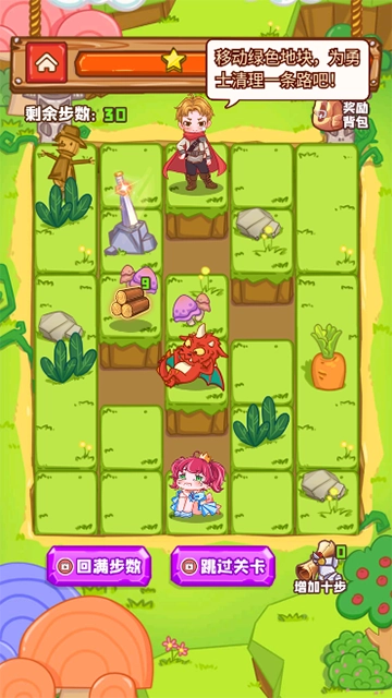 在限定的移动步数里,拖动勇士地块,拾起宝剑,刺向恶龙。